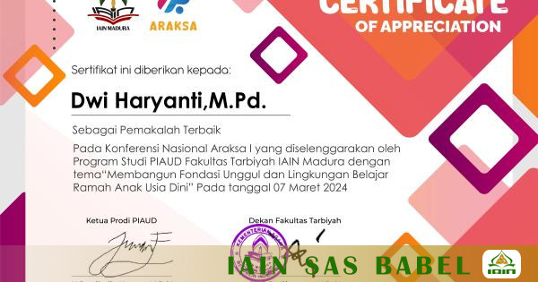 IAINSASBABEL.AC.ID BANGKA.Bangka,20/3/2024. Dosen Muda Prodi Pendidikan Islam Anak Usia Dini (PIAUD) Fakultas Tarbiyah IAIN SAS Bangka Belitung terpilih menjadi Pemakalah terbaik kepada Dwi Haryanti, M.Pd.I Di konferensi Araksa I yang telah diikuti pada Kamis lalu (7/3/2024) yang diselenggarakan di IAIN Madura.