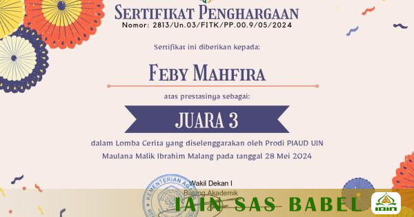 IAINSASBABEL.AC.ID BANGKA. Keberhasilan Yang Diraih Oleh Salah Satu Mahasiswi Institut Agama Islam Negeri Syaikh Abdurrahman Siddik Bangka Belitung(IAIN SAS Babel), Dengan Meraih Juara III Dalam Lomba BerceritaTingkat Nasional Tahun 2024 yang diikuti Ratusan peserta.