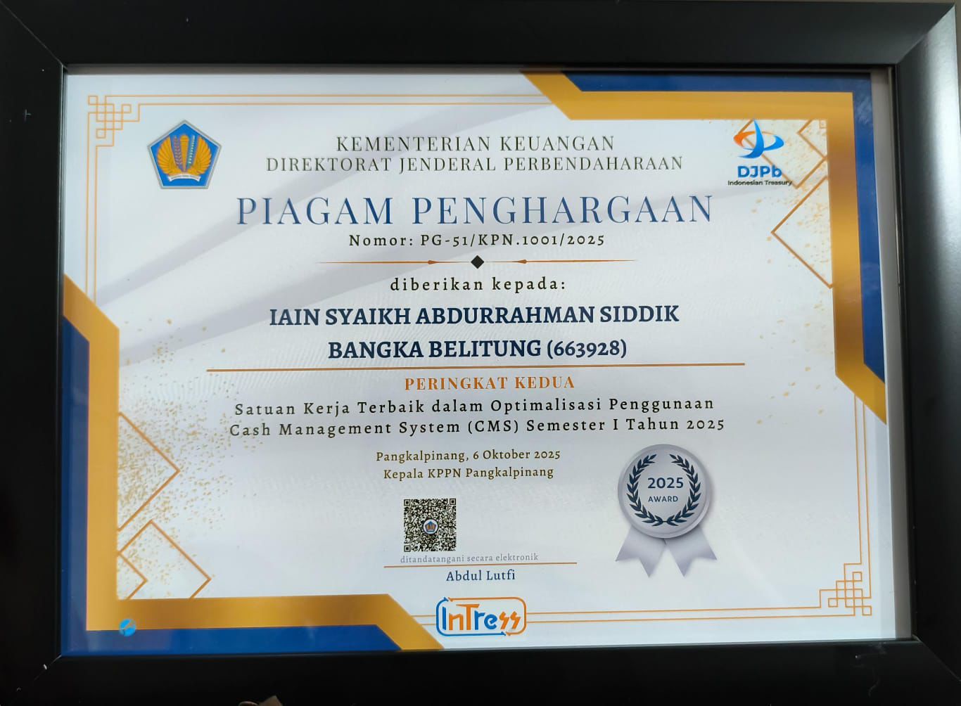 IAINSASBABEL.AC.ID BANGKA.Institut Agama Islam Negeri(IAIN) Syaikh Abdurrahman Siddik (SAS) Bangka Belitung (IAIN SAS Babel) terima Apresiasi Satuan Kerja Berkinerja Terbaik kedua Semester I Tahun 2025 kategori optimalisasi penggunaan Cash Management System (CMS) dari Kantor Pelayanan Perbendaharaan Negara (KPPN), Pangkalpinang.