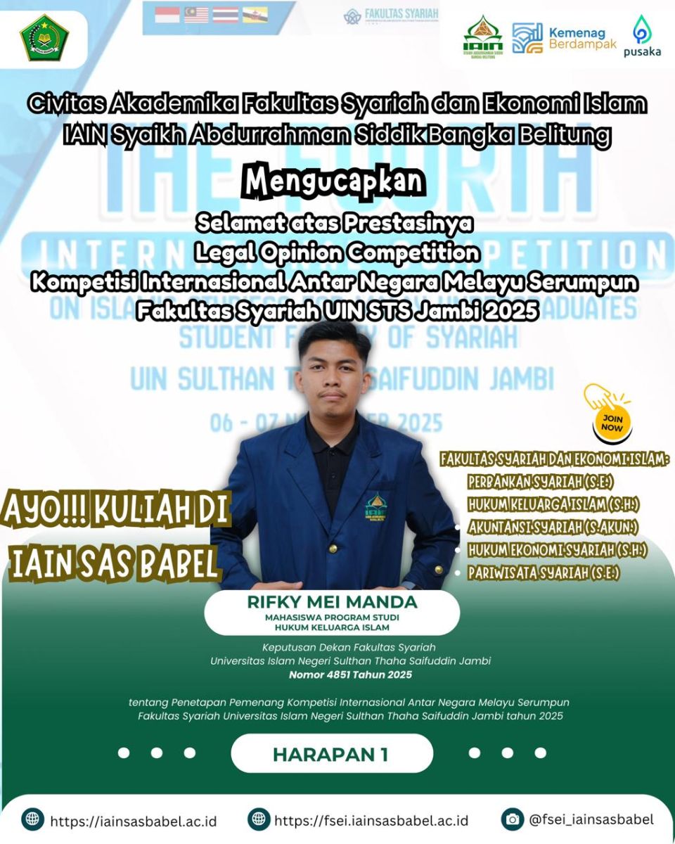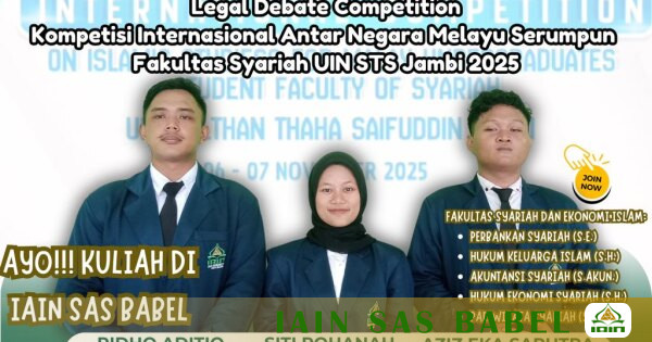 IAINSASBABEL.AC.ID BANGKA. Kabar gembira datang dari Fakultas Syariah dan Ekonomi Islam(FSEI) IAIN Syaikh Abdurrahman Siddik Bangka Belitung.Dalam ajang Kompetisi Internasional Antar Negara Melayu Serumpun 2025 yang digelar oleh Fakultas Syari’ah UIN Sulthan Thaha Saifuddin Jambi secara daring (online) pada Kamis, 6 November 2025, delegasi IAIN SAS Babel berhasil menorehkan prestasi gemilang.