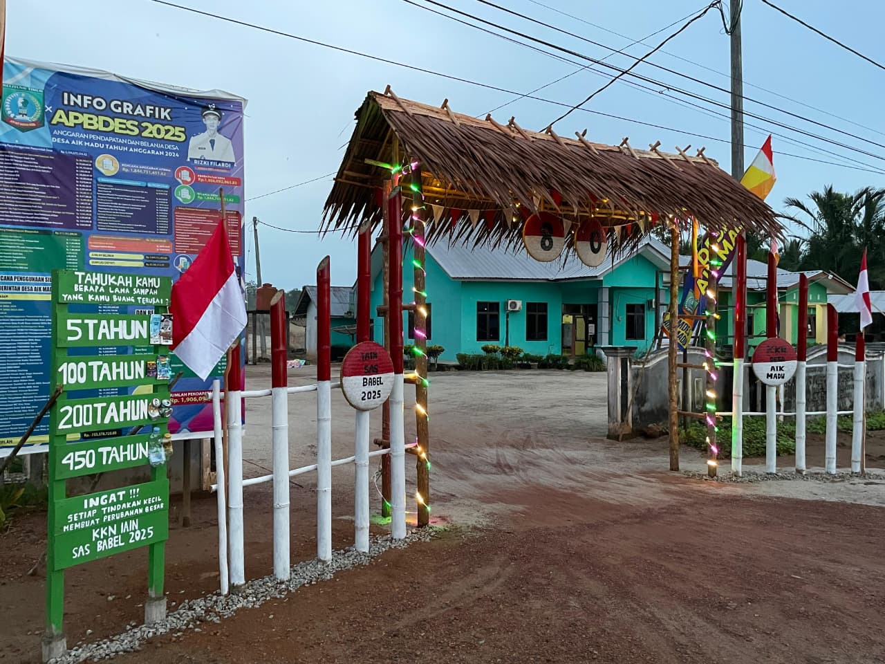 IAINSASBABEL.AC.ID BANGKA. Dalam rangka memeriahkan Hari Ulang Tahun (HUT) Kemerdekaan Republik Indonesia ke-80, Mahasiswa Kelompok 2 Kuliah Kerja Nyata (KKN) IAIN Syaikh Abdurrahman Siddik Bangka Belitung bersama warga Desa Aik Madu, Kecamatan Simpang Renggiang, Kabupaten Belitung Timur, berpartisipasi dalam lomba hias gapura yang diselenggarakan oleh PLN Unit Induk Wilayah (UIW) Bangka Belitung pada 27 juli-08 Agustus 2025.