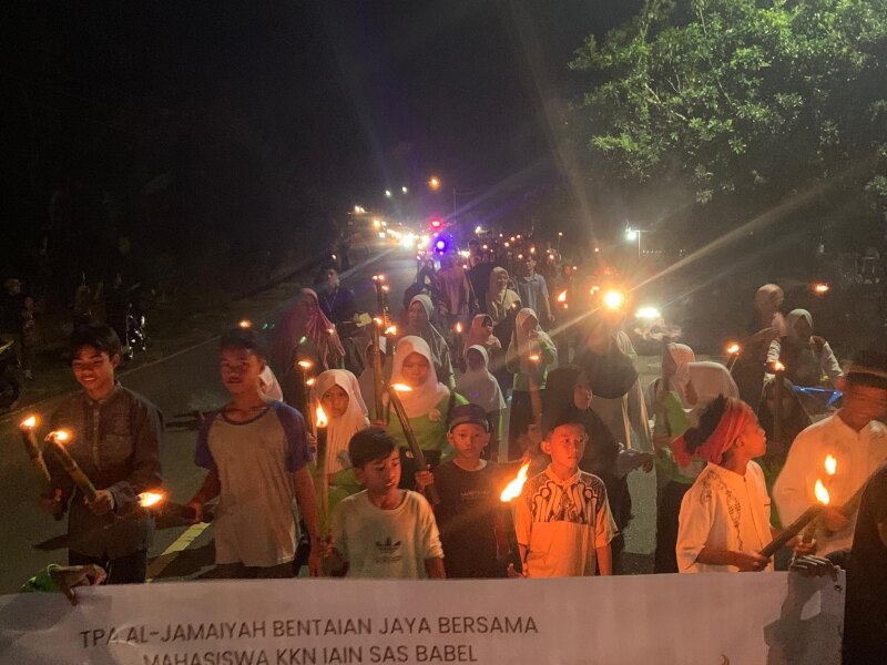 IAINSASBABEL.AC.ID BANGKA.Mahasiswa Kuliah Kerja Nyata (KKN) dari Institut Agama Islam Negeri (IAIN) Syaikh Abdurrahman Siddik (SAS) Bangka Belitung bersama dengan Masyarakat Desa Bentaian Jaya mengadakan pawai obor untuk merayakan Tahun Baru Islam 1446 Hijriah pada Sabtu (13/7).