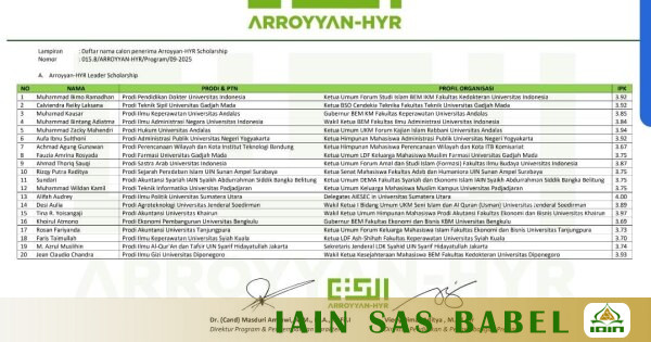 IAINSASBABEL.AC.ID BANGKA. Mahasiswa Fakultas Syariah dan Ekonomi Islam(FSEI) Institut Agama Islam Negeri (IAIN)Syaikh Abdurrahman Siddik(SAS) Bangka Belitung kembali mengharumkan nama kampus setelah dinyatakan lolos dalam ajang program ARROYYAN-HYR LEADER SCHOLARSHIP 2025 - 2026.Jumat,19/9/2025.