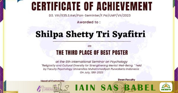 IAINSASBABEL.AC.ID BANGKA. Prestasi di Tingkat Internasional kembali ditorehkan oleh Shilpa Shetty Tri Syafitri Mahasiswi Program Studi Psikologi Islam Institut Agama Islam Negeri Syaikh Abdurrahman Siddik Bangka Belitung (IAIN SAS Babel) berhasil meraih 3rd Place for The Best Poster Presentation dalam ajang 6th International Seminar On Psychology (ISPsy) 2023 yang diselenggarakan oleh Universitas Muhammadiyah Purwokerto (UMP) yang dilaksanakan acara puncaknya pada 18 Juli 2023.
