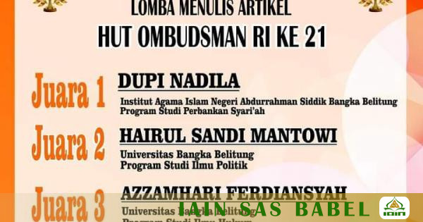 IAINSASBABEL.AC.ID - BANGKA. Kebahagiaan kembali dirasakan oleh keluarga besar Fakultas Syariah dan Ekonomi Islam(FSEI) IAIN Syaikh Abdurrahman Siddik Bangka Belitung. Hal ini terjadi setelah salah satu mahasiswi Prodi Perbankan Syariah (PS) meraih gelar juara 1 pada ajang lomba menulis artikel yang diadakan oleh Ombudsman Perwakilan Bangka Belitung. Dupi Nadila yang merupakan mahasiswi semester 6 Prodi PS menulis artikel dengan judul "Menumbuhkan Kesadaran Masyarakat Dalam Partisipasi Pengawasan Pelayanan Publik" dan berhasil mengantarkannya menjurai lomba tersebut.