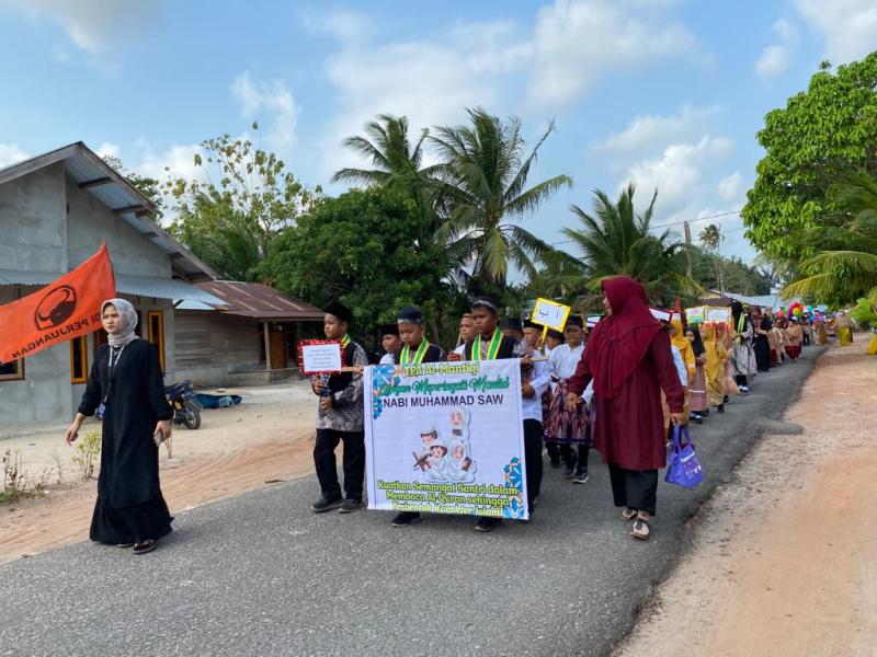IAINSASBABEL.AC.ID BELITUNG. Dalam rangka memperingati hari maulid nabi muhammad saw 1445 hijriah mahasiswa Kuliah Kerja Nyata (KKN) Institut Agama Islam Negeri Syaikh Abdurrahman Siddik Bangka Belitung IAIN menggelar pawai taaruf yang dilakukan dengan berkeliling kampung Mentigi, Kamis(28/09/2023).