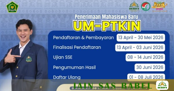 IAINSASBABEL.AC.ID BANGKA. Institut Agama Islam Negeri (IAIN) Syaikh Abdurrahman Siddik Bangka Belitung membuka kesempatan bagi calon mahasiswa baru untuk melanjutkan studi melalui jalur Ujian Masuk Perguruan Tinggi Keagamaan Islam Negeri (UM-PTKIN) Tahun 2026 yang resmi dibuka mulai 13 April hingga 30 Mei 2026.