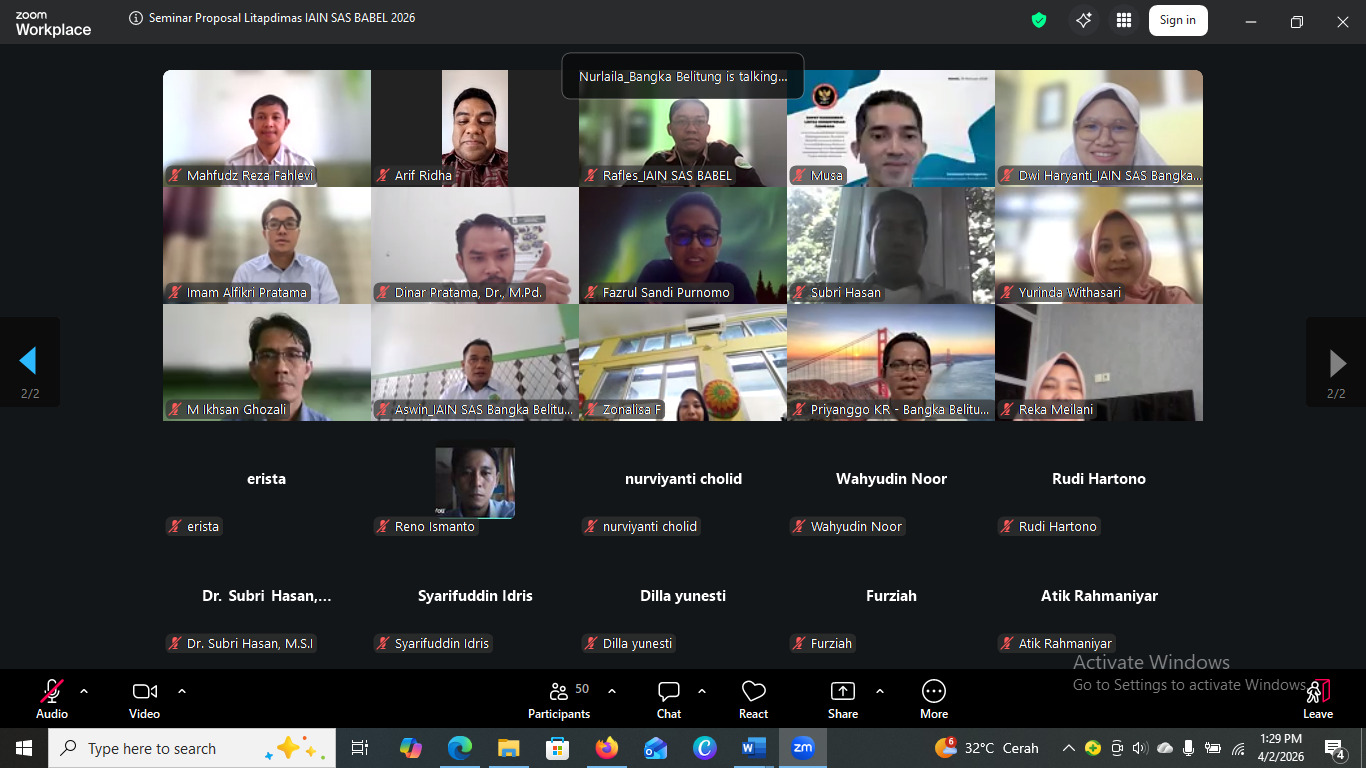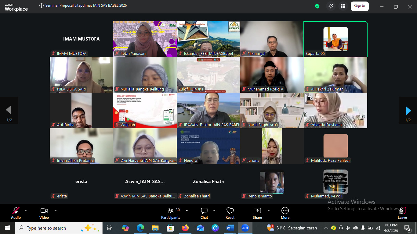 Seminar proposal litapdimas IAIN SAS Babel Tahun Anggaran 2026 melibatkan 6 reviewer nasional untuk menilai presentasi 27 proposal dari 6 (enam) kluster penelitian. Seminar berlangsung secara serentak di tiga breakroom yang disiapkan panitia. Breakroom 1 dengan reviewer Prof. Dr. Muhammad Ansor, M.A dan Prof. Dr. Ayub Mursalin, M.A, dimoderatori oleh Yolanda Destiana, M.M, membedah proposal dari kluster penelitian kapasitas dan program studi. Selanjutnya di breakroom 2 ada Prof. Dr. Sunhaji, M.Ag dan Prof. Dr. Imam Mustofa, M.S.I, dimoderatori oleh Pebri Yanasari, MA, mengulik proposal dari kluster penelitian Interdisipliner dan Terapan Kajian Strategis Nasional.