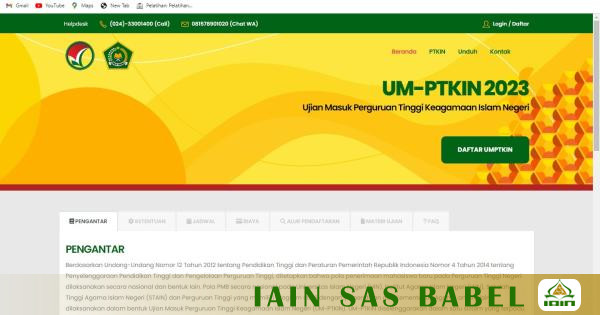 IAINSASBABEL.AC.ID BANGKA. Pendaftaran Ujian Masuk Perguruan Tinggi Keagamaan Islam Negeri( UM-PTKIN ) 2023 lima hari lagi penutupan. Sesuai jadwal, secara resmi pendaftaran UM-PTKIN 2023 akan ditutup pada Senin 15 Mei 2023