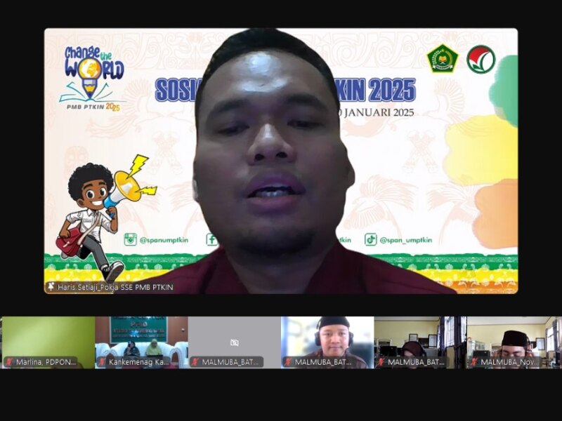 IAINSASBABEL.AC.ID BANGKA. Memasuki masa pengisian PDSS yang dimulai 6 hingga 25 Januari 2025, Panitia Lokal Penerimaan Mahasiswa Baru Perguruan Tinggi Keagamaan Islam Negeri (PMB PTKIN) IAIN SAS Bangka Belitung menggelar kegiatan sosialisasi untuk jalur Seleksi Prestasi Akademik Nasional Perguruan Tinggi Keagamaan Islam Negeri (SPAN PTKIN) dan UM-PTKIN Tahun 2025 menggandeng Kantor Wilayah Kementerian Agama Provinsi Kepulauan Bangka Belitung secara daring dan luring, bertempat di Aula Mas’ud Hasa ln Qolay Kanwil Kemenag Babel, Kamis, 23/1/2025.
