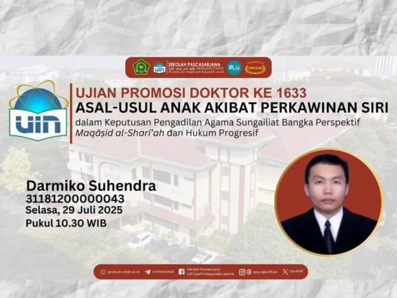 Darmiko Suhendra berhasil mempertahankan disertasi berjudul "Asal-Usul Anak Akibat Perkawinan Siri dalam Keputusan Pengadilan Agama Sungailiat Bangka Perspektif Maqāṣid al-Sharī’ah dan Hukum Progresif".