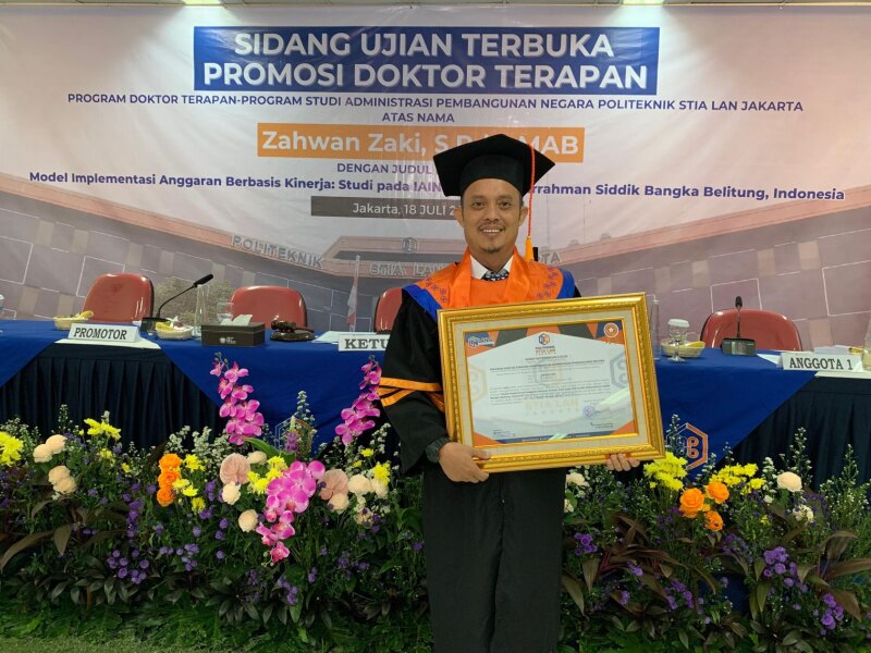 Tendik yang telah menyelesaikan rangkaian pendidikan doktor yakni Dr. Tr. Zahwan Zaki, MAB yang merupakan Jabatan Fungsional Analis Pengelolaan Keuangan APBN Ahli Muda pada Biro Akademik, Kemahasiswaan dan Perencanaan IAIN SAS Babel, di Ruangan Serba Guna Politeknik STIA LAN Jakarta, Kamis 18/7/2024.