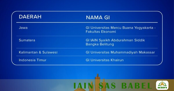 IAINSASBABEL.AC.ID BANGKA. Institut Agama Islam Negeri(IAIN)Syaikh Abdurrahman Siddik(SAS) Bangka Belitung menorehkan prestasi membanggakan pada tingkat regional. Unit Kegiatan Khusus (UKK) Galeri Investasi Syariah (GIS) berhasil meraih kategori UKK GIS dengan Kegiatan Terbanyak se-Sumatra pada ajang Galeri Investasi Competition yang diselenggarakan oleh Phintraco Sekuritas bekerja sama dengan bursa Efek Indonesia (BEI).
